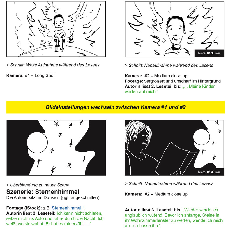 Vom Storyboard bis zum fertigen Film. Bei diesem Projekt ging es darum, die von der Autorin Nicola Henselmann gelesenen Szenen aus ihrem Roman "Septemberschnee" in einem kurzen Film zu visualisieren. Ich habe mich hier für ein Green Screen Setting entschieden, bei dem in der Postproduktion der grüne Hintergrund durch Video Footage ausgetauscht wurde. Natürliche Hintergrundgeräusche untermalen das Erlebnis der Geschichte.